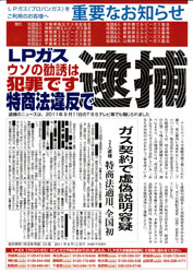 これは、消費者への悪質な勧誘行為が刑事罰の対象となること、また不適正な勧誘行為で困っている場合には、各県協会の「お客様窓口」や、所轄の警察署への通報・相談を呼びかけることを目的としたもの。(詳細はプロパン産業新聞2011年9月13日付で) | ||
